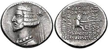 В целом, среди монет Парфии на аверсе, рядом с портретом царя или прямо на тиаре нередко чеканилась звезда как знак его божественного происхождения. Так, на монете Митридата III, правил с 58/57 до 54 года, на аверсе за головой царя отчеканена звезда, иногда она чеканилась с обеих сторон головы. Между тем на реверсе изображен сидящий на троне лучник (Аршак I) и, среди прочего, греческая легенда: «Царь царей Аршак, Великий, Справедливый, Благодетель, Бог…»).